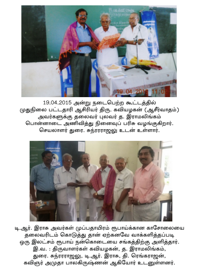 2. 15.03.2015 அன்று நடைபெற்ற கூட்டத்தில் டி. ஆர் . இராசு அவர்கள் முப்பதாயிரம் ரூபாய் காசோலை தலைவரிடம் கொடுத்து தான் ஏற்கனவே வாக்களித்தப்படி ஒரு இலட்சம் ரூபாய் நன்கொடையை சங்கத்திற்கு அளித்தார்.